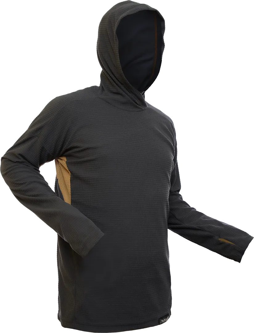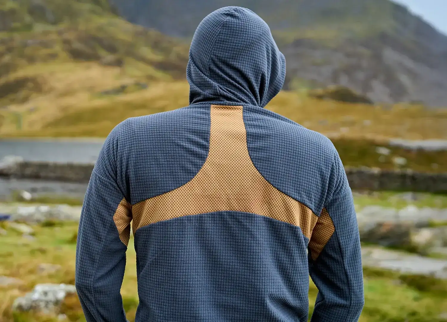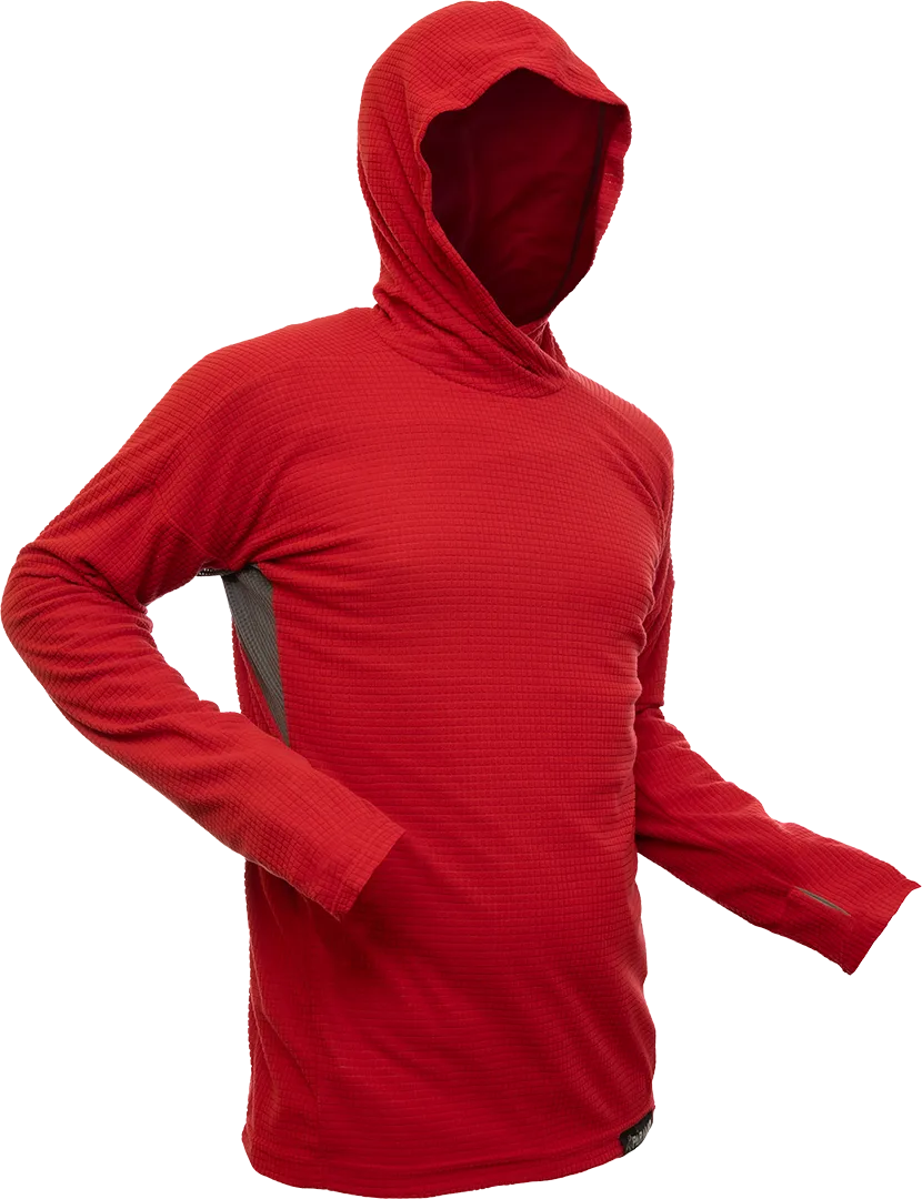 When covered with a wind-proof the fleecy grid squares trap air and provide excellent insulation. When uncovered the gaps between the grid allow moving air to go straight to the skin, promoting cooling. The structure of this next-to-the-skin fabric optimises lateral water movement for evaporative cooling, keeping you comfortable when you are working hard.